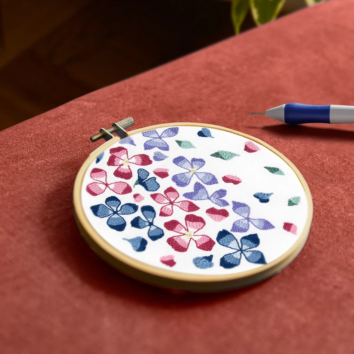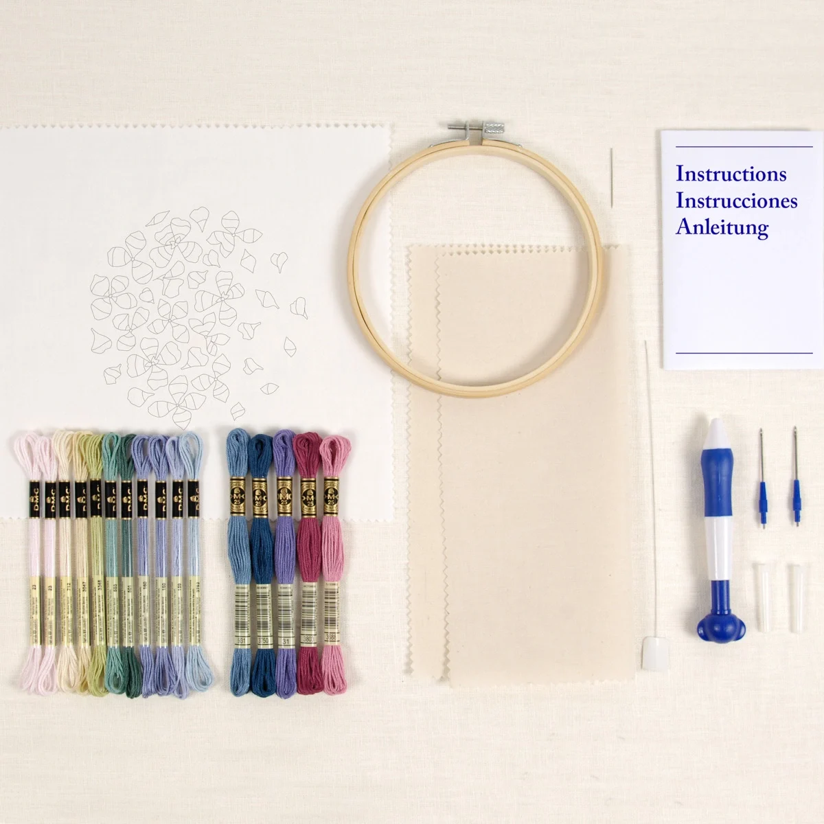 Complete punch needle kit, includes fabric, hoop, needle, DMC skeins and instructions