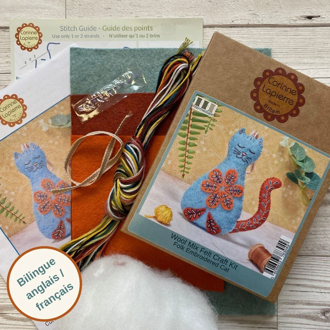 The Anglo-French brand Corinne Lapierre has developed this lovely kit, in a folk design, with which you will create this blue kitten, ideal as a gift or to decorate your home.