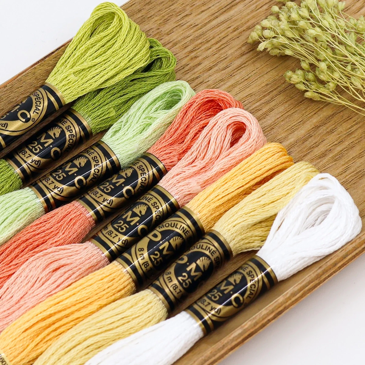 This selection combines fresh greens, peach tones, soft yellows and pure white – perfect for sunny, delicate embroideries full of freshness.