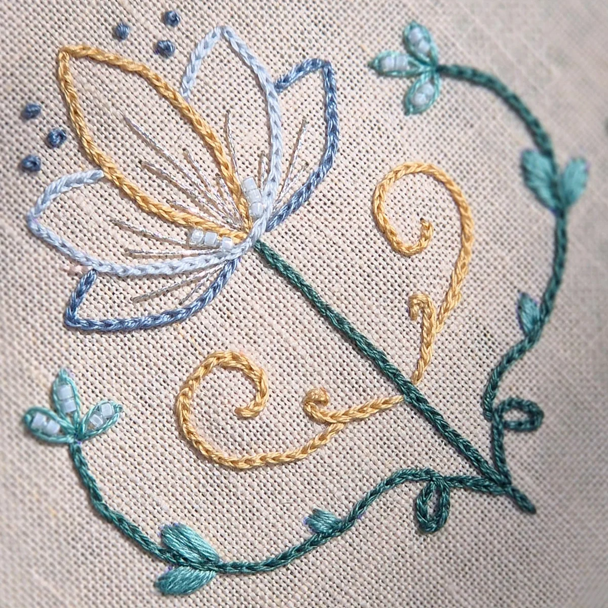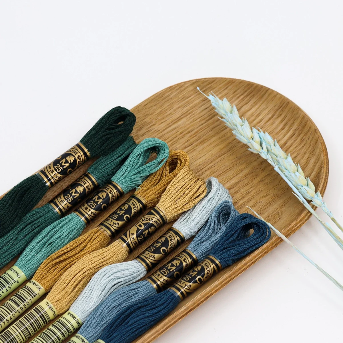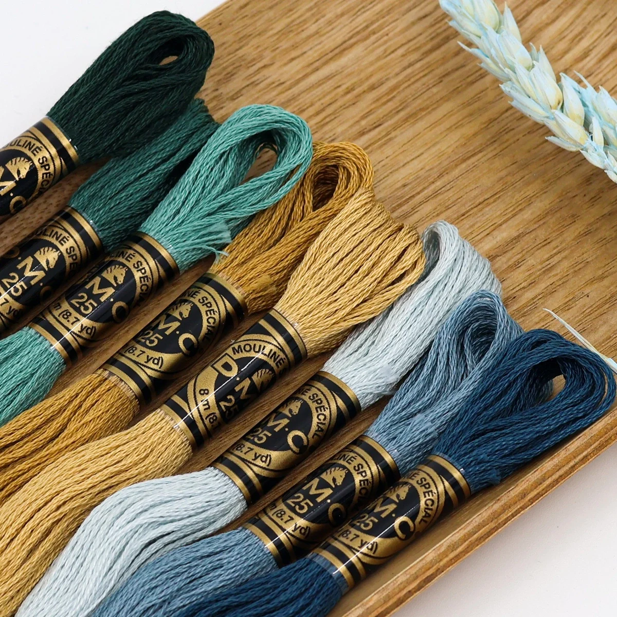 A sophisticated palette combining intense greens, earthy golds and grayish blues – perfect for elegant, natural embroidery full of depth.
