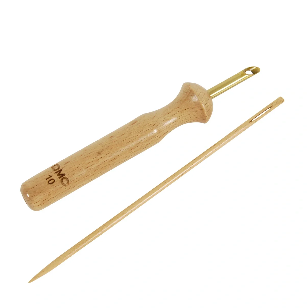 Agulha de tamanho 10, com cabo de madeira e ponta em aço inoxidável de 3,5 mm.