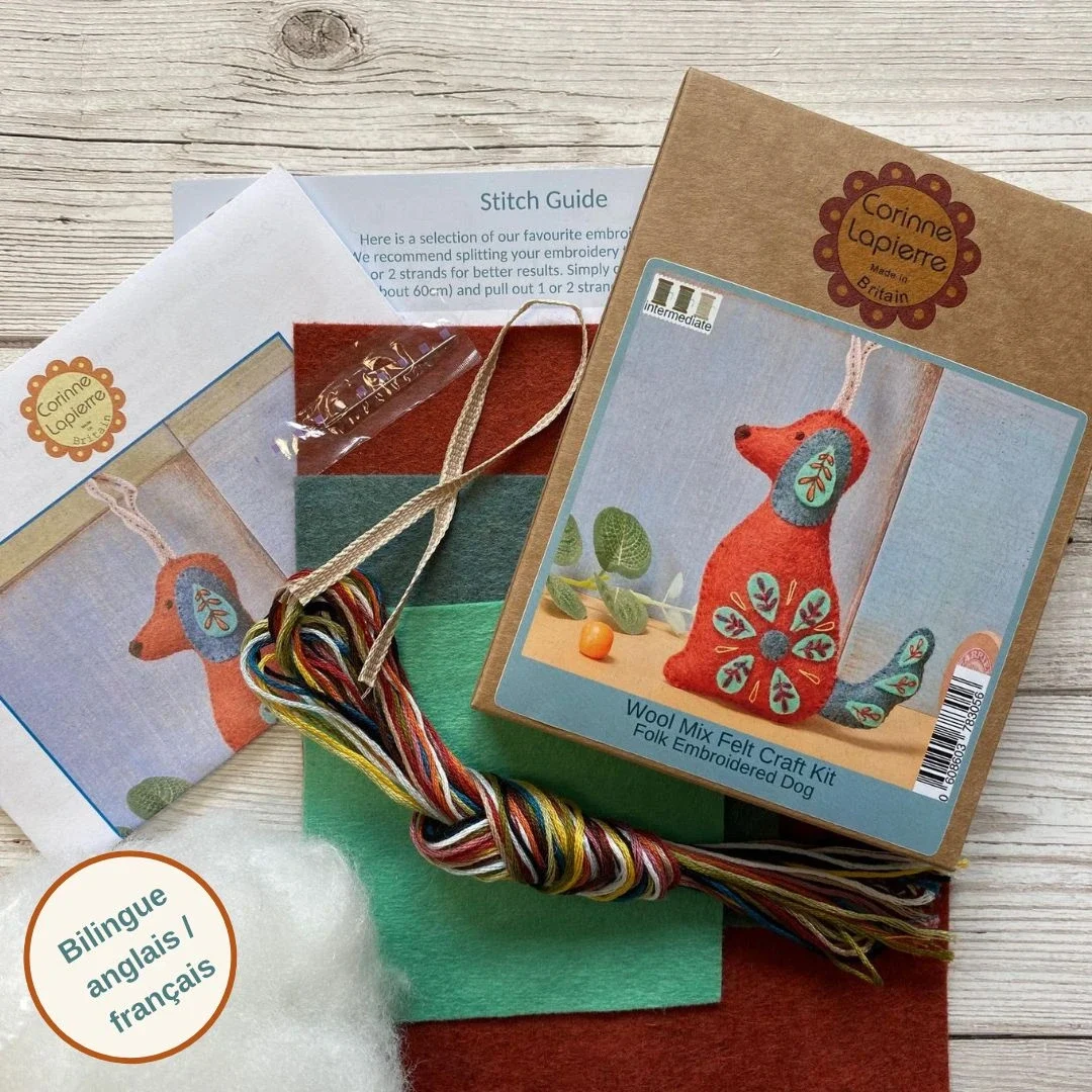 A marca anglo-francesa Corinne Lapierre desenvolveu este kit amoroso, num design folk, com o qual vais criar este cachorro, ideal para ofereceres ou decorares a tua casa.