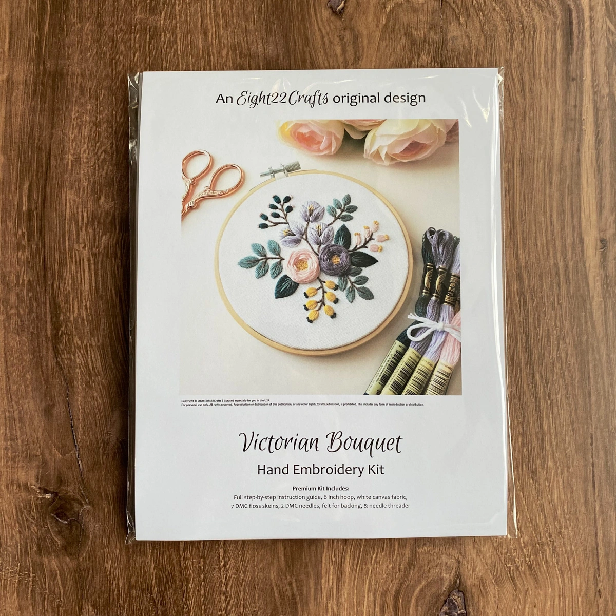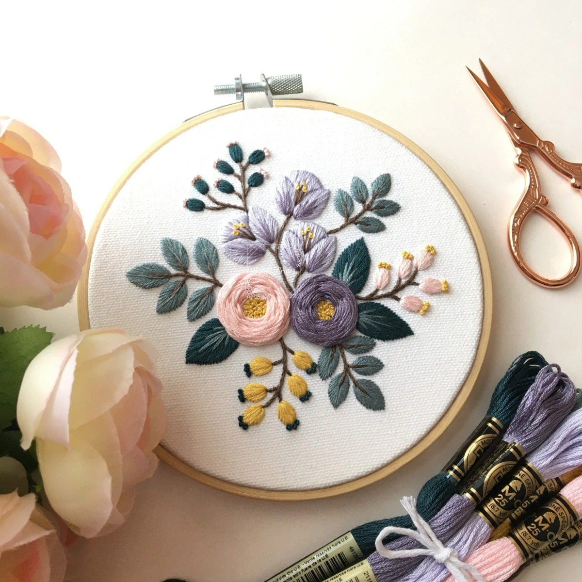 Kit completo de bordado floral em tons pastel. Inclui tecido, meadas e agulhas DMC, bastidor, feltro e instruções.