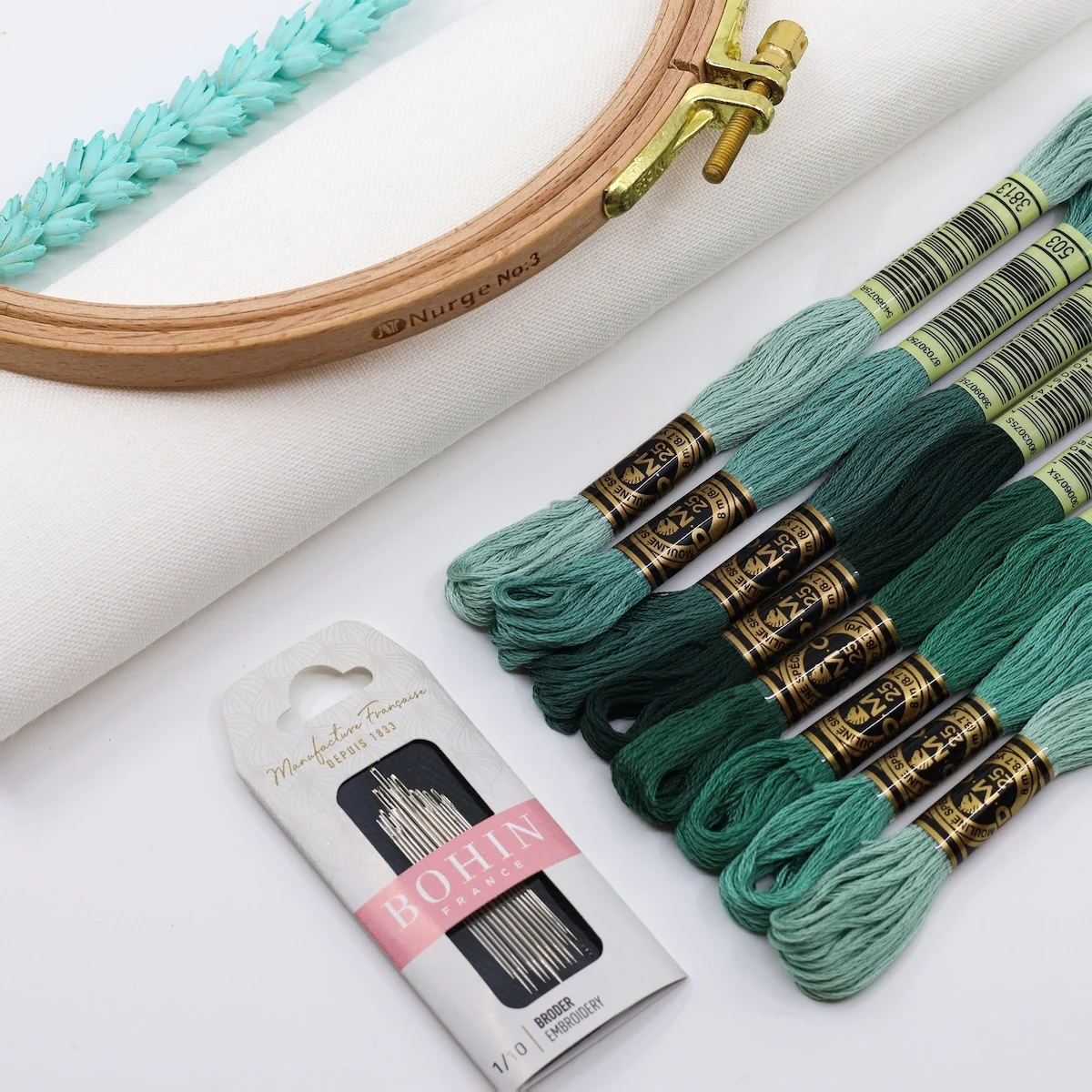 Um recorte de linho numa cor que entra em perfeita sintonia com o conjunto de 8 meadas DMC Mouliné Spécial;