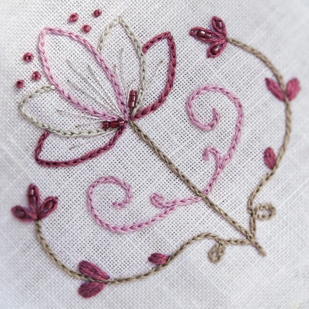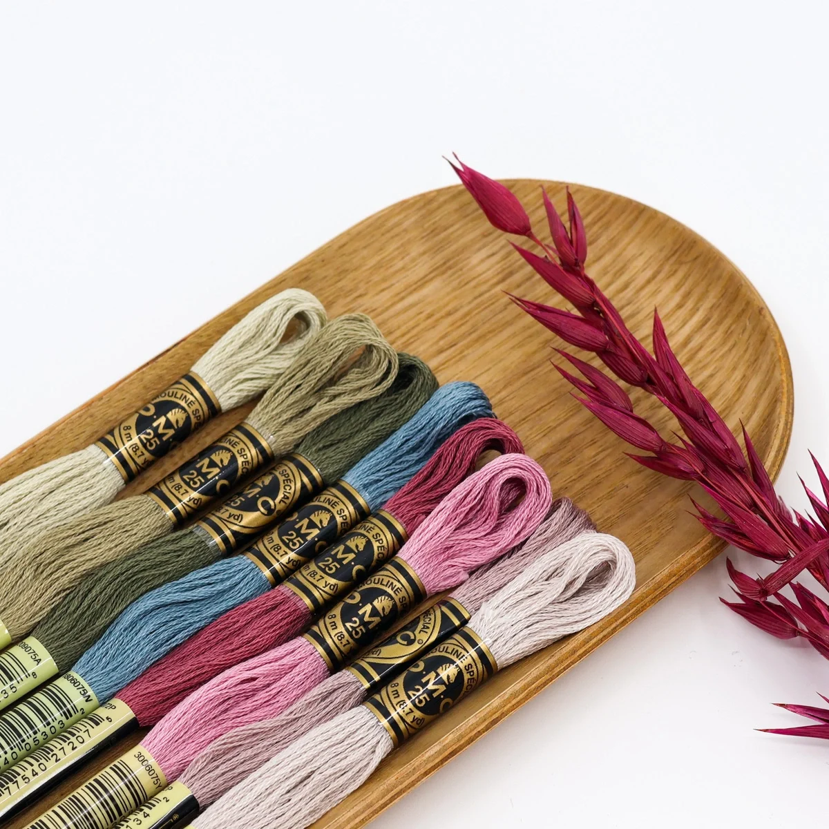 Uma paleta suave e equilibrada que combina verdes secos, azuis acinzentados e rosas médios, com neutros delicados — perfeita para bordados naturais, românticos e cheios de harmonia.