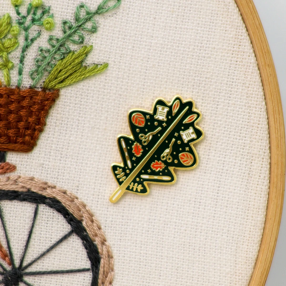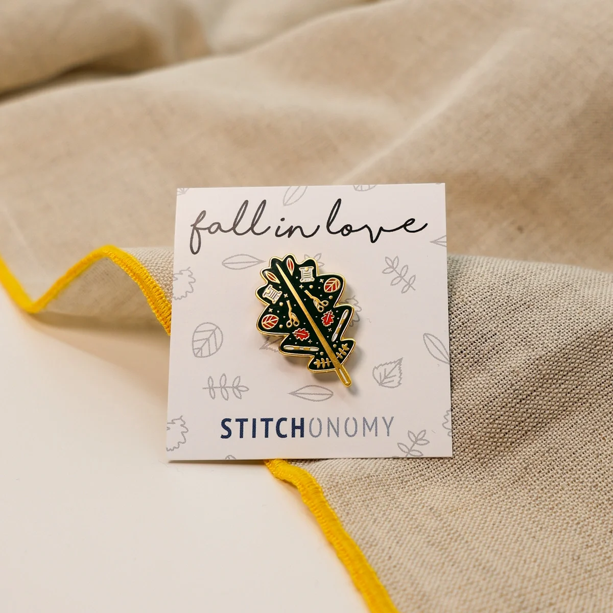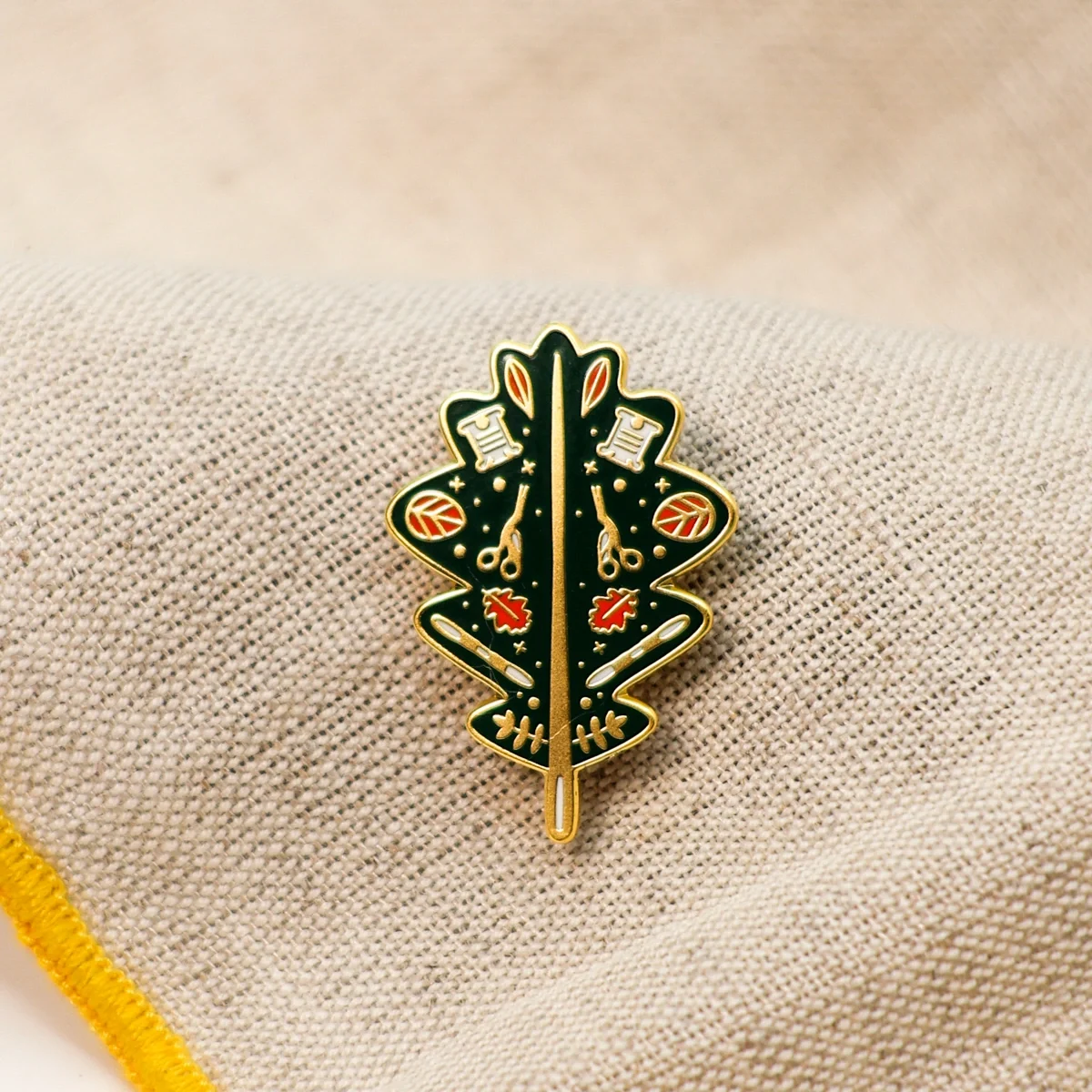 Nós perdemo-nos de amores por este da pequena marca Stitchonomy. Esta pequena folha de outono está adornada de tesourinhas de bordado e enche-nos a vista.
