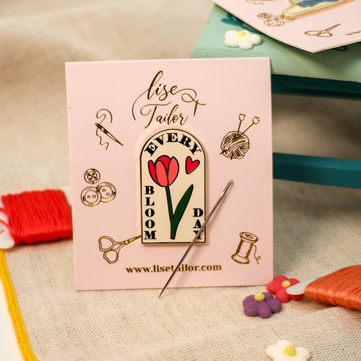Este suporte magnético com desenho túlipa prende-se ao tecido através de ímans e mantém as agulhas juntas, evitando que bordadeiras distraídas como eu as percam.