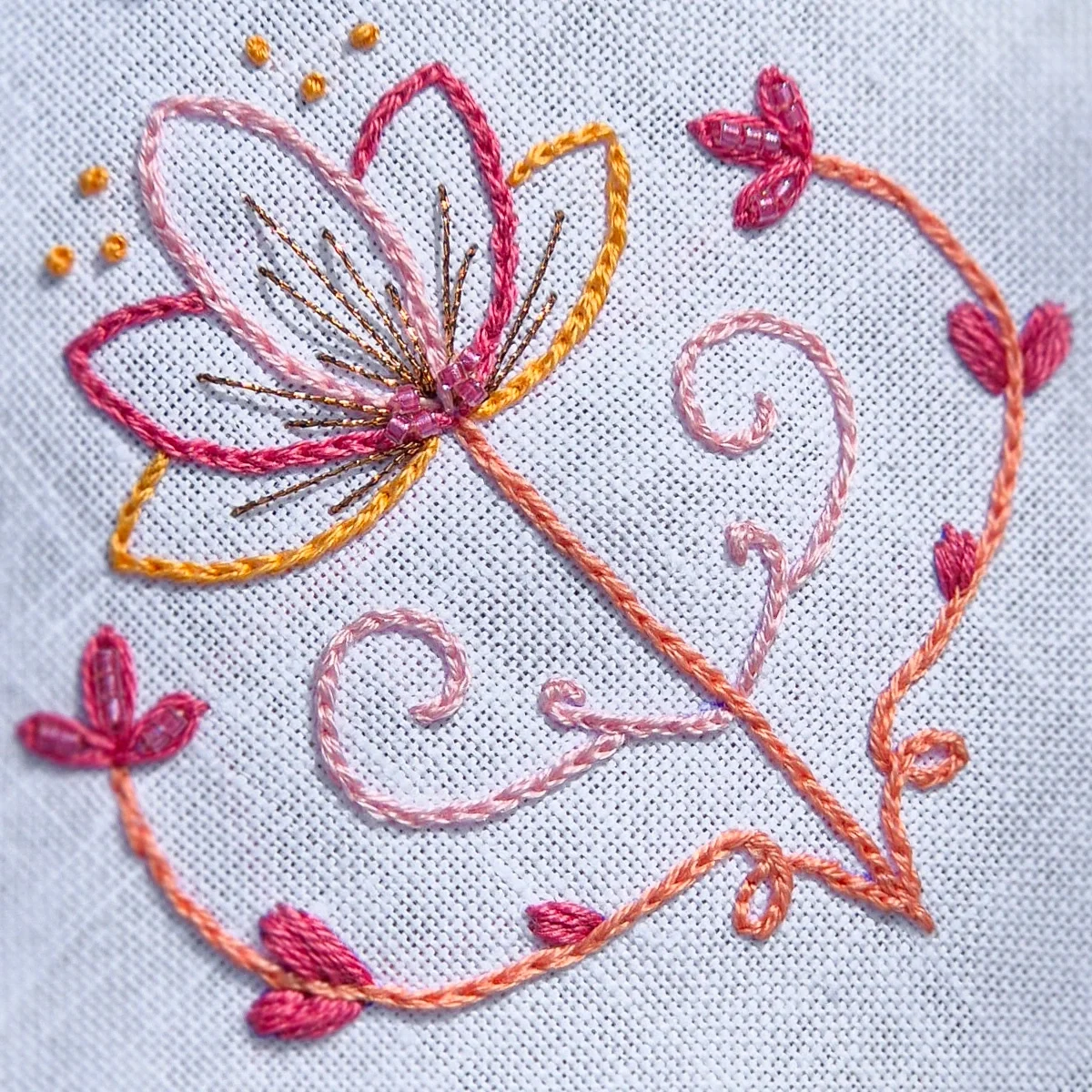 Esta seleção reúne laranjas luminosos, corais vibrantes e rosas quentes, equilibrados por um malva profundo — uma paleta energética e alegre, perfeita para quem quer criar bordados cheios de vida e contraste.